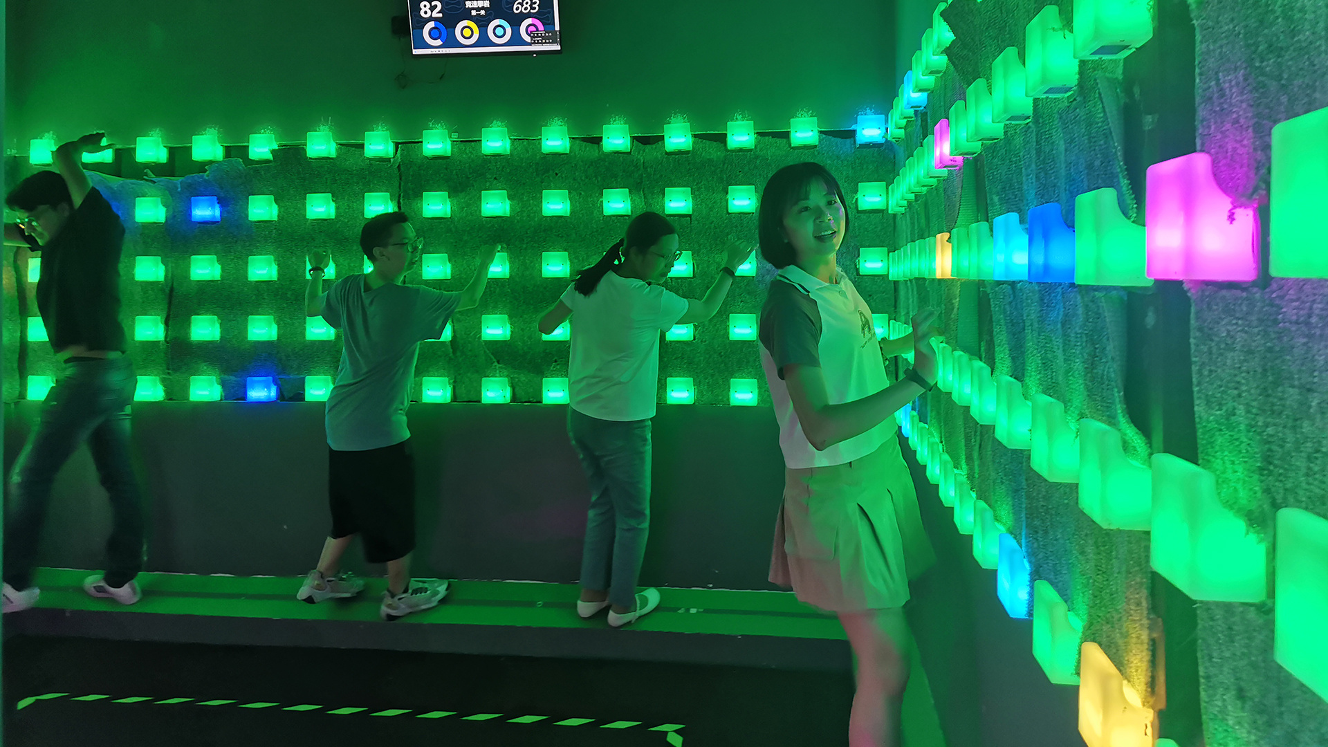 Mur d'escalade LED interactif évaluant l'agilité, la stratégie et le travail d'équipe.