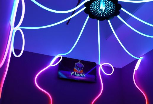 Concept d'arènes de jeux interactifs basé sur la technologie LED. 8 salles immersives combinant néons, son et défis physiques pour une expérience unique.