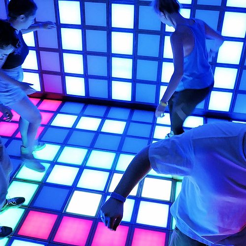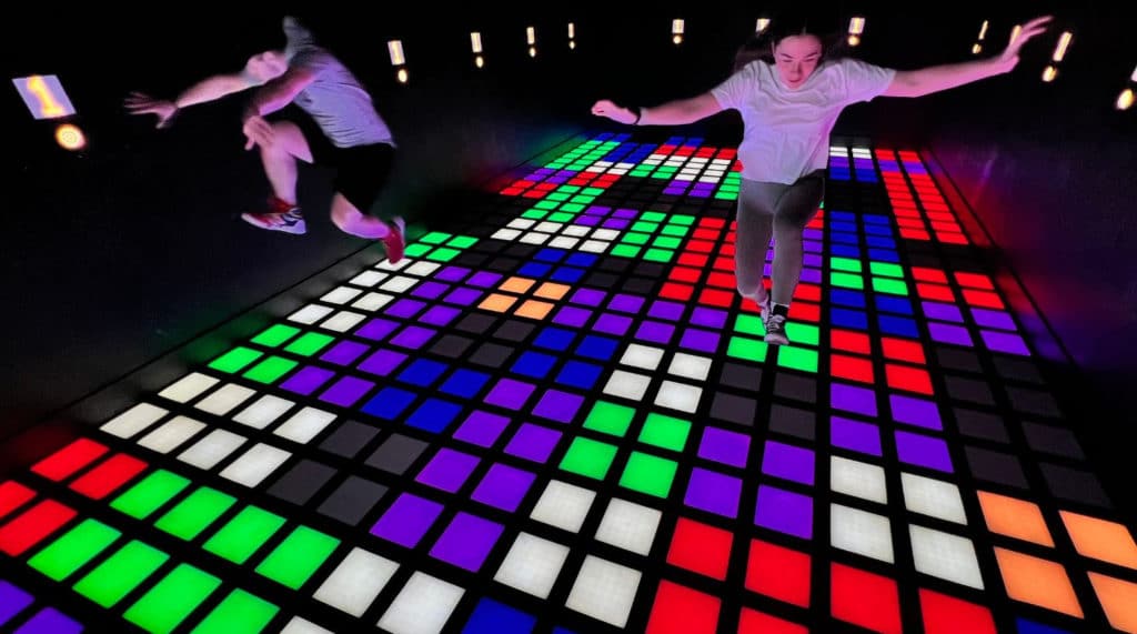 Sol LED interactif avec capteurs embarqués. Systèmes RGB LED au sol pour des défis de vitesse et d'agilité. 5 modes de jeu, 50 niveaux.